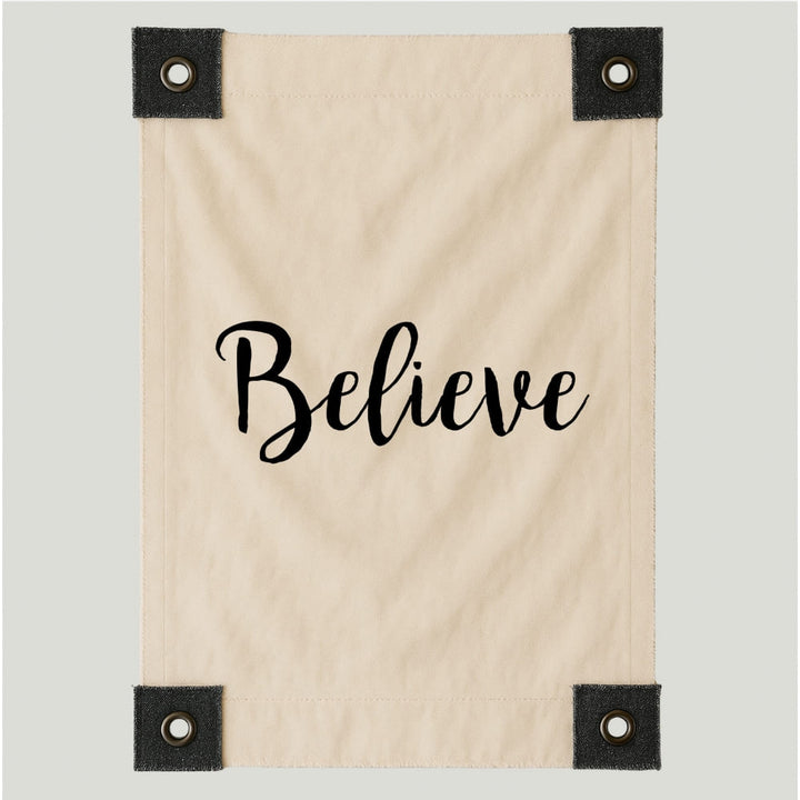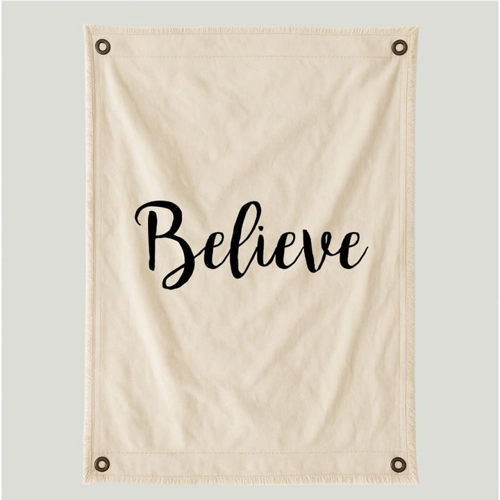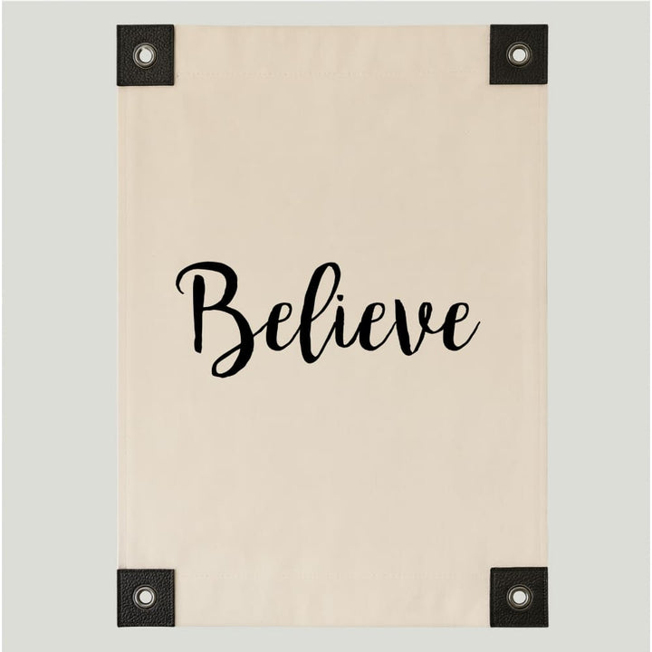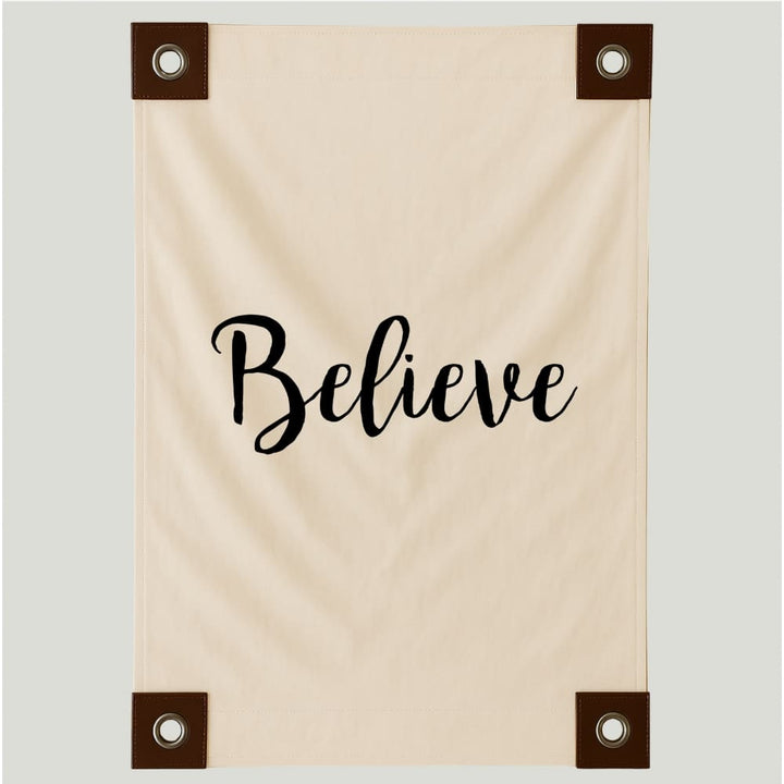 Lienzo simple y decorativo con la palabra Believe en negro sobre fondo natural. Su diseño moderno y minimalista invita a transmitir confianza y energía positiva en cualquier espacio.