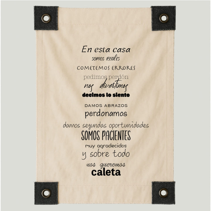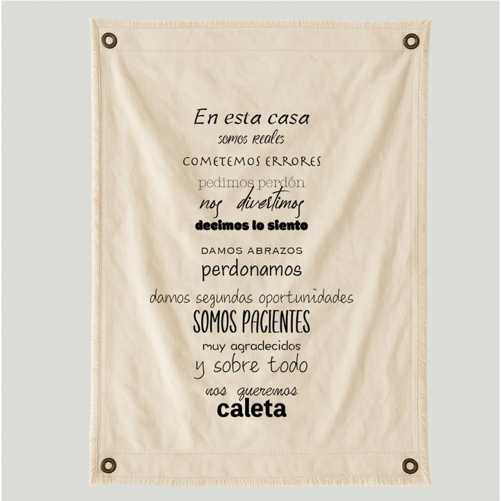 Lienzo simple y decorativo con frase familiar que transmite amor, gratitud y autenticidad. Un mensaje lleno de calidez que refleja la esencia de un hogar real, donde se cometen errores, se pide perdón y se quiere con fuerza.