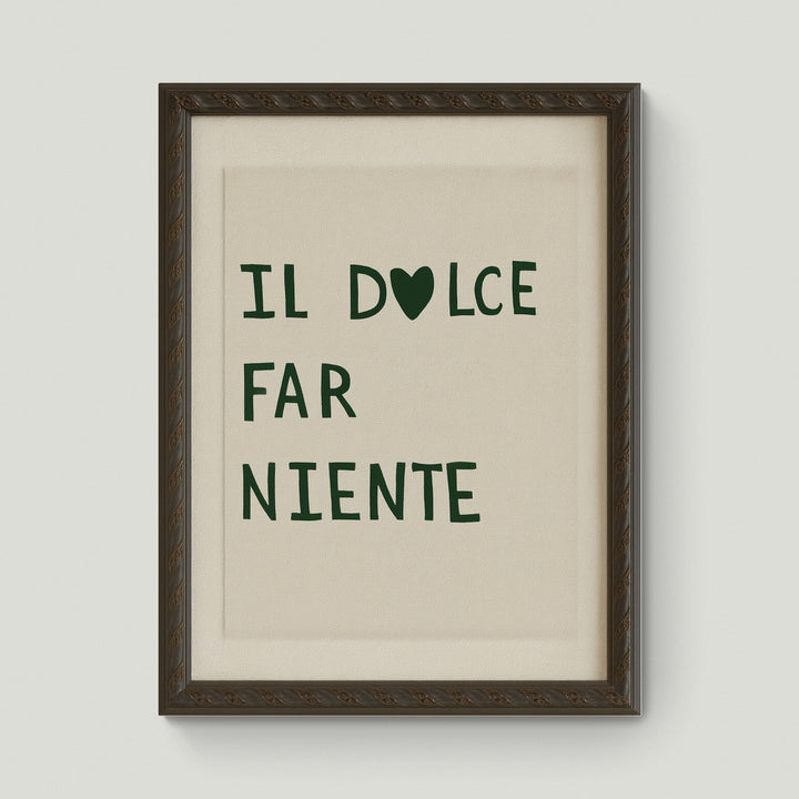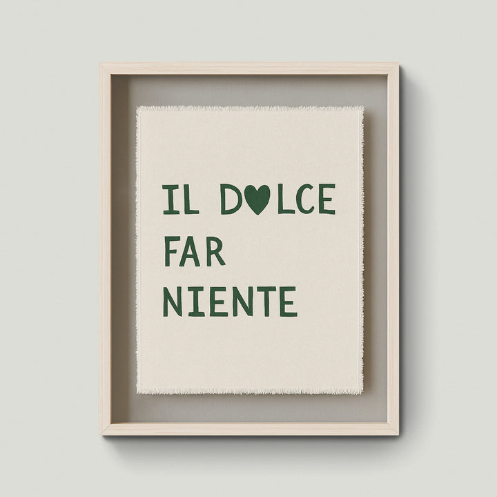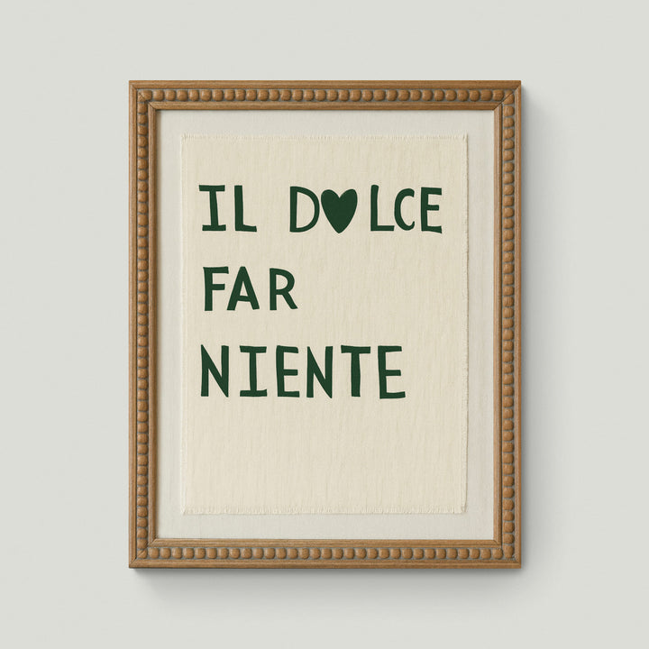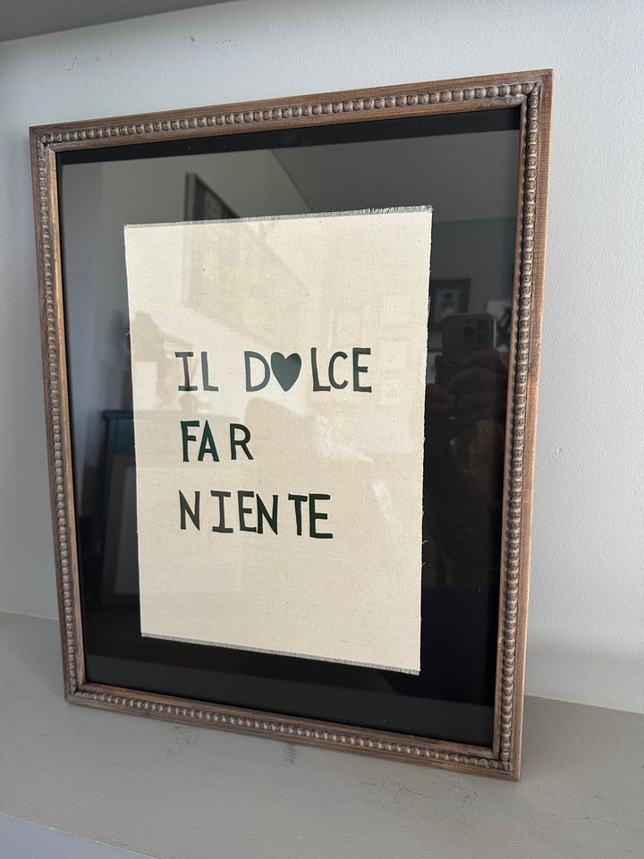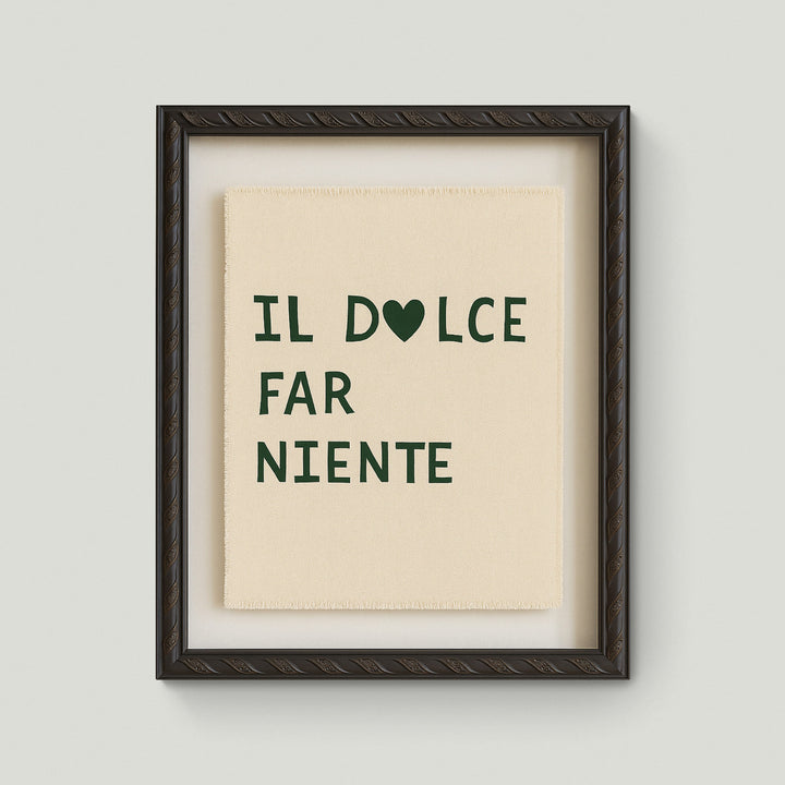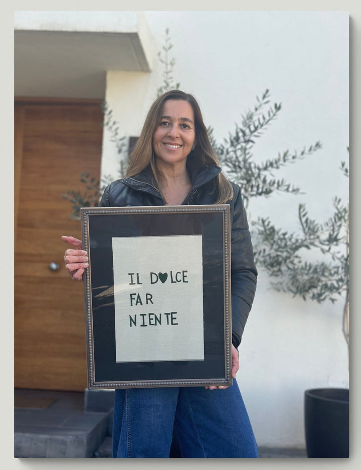 Cuadro decorativo en tela de fibras naturales, con frase en italiano y diseño minimalista. Sus tonos y estilo simple aportan calidez y una elegancia atemporal a cualquier espacio. Una pieza liviana y sofisticada, ideal para decorar muros con cuadros en tela de forma auténtica y natural.
