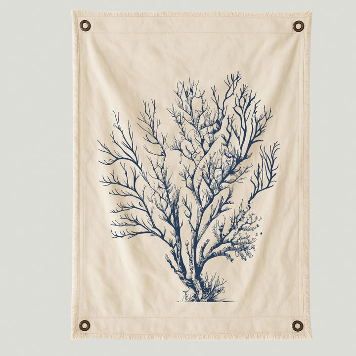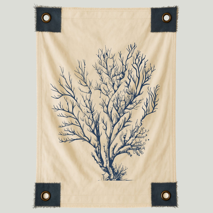 Lienzo con ilustración detallada de un coral en tonos azul marino, inspirado en las formas naturales del fondo del mar. Su trazo delicado y realista transmite frescura y profundidad, evocando la calma y belleza de la vida marina.