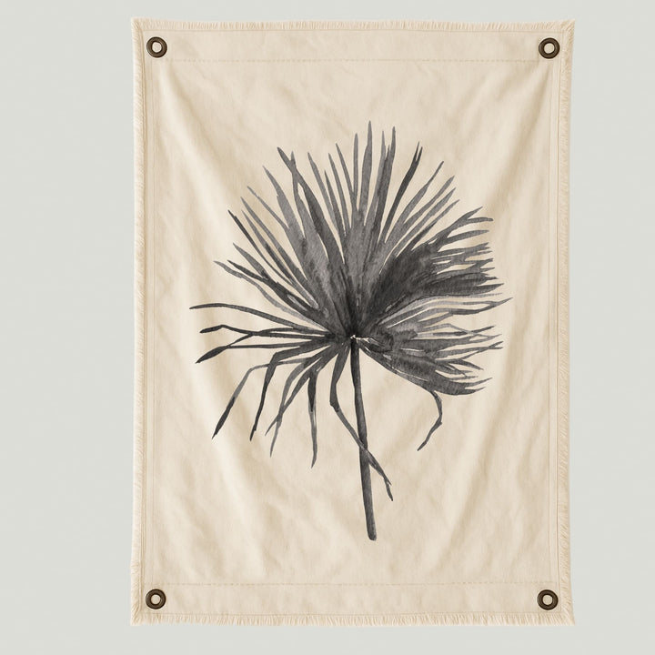 Lienzo con hoja de palma estampada en tonos grises y negros, logrando un equilibrio perfecto entre lo orgánico y lo moderno.