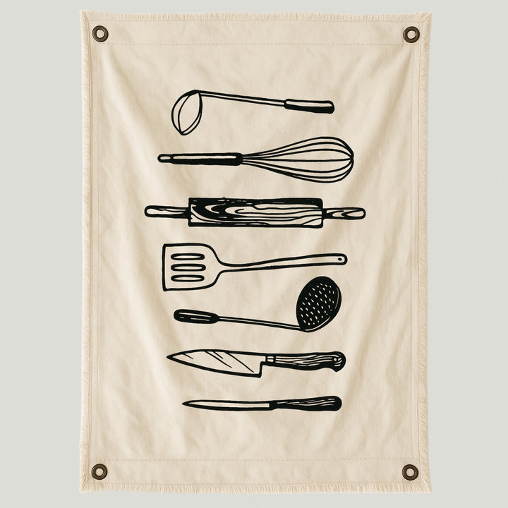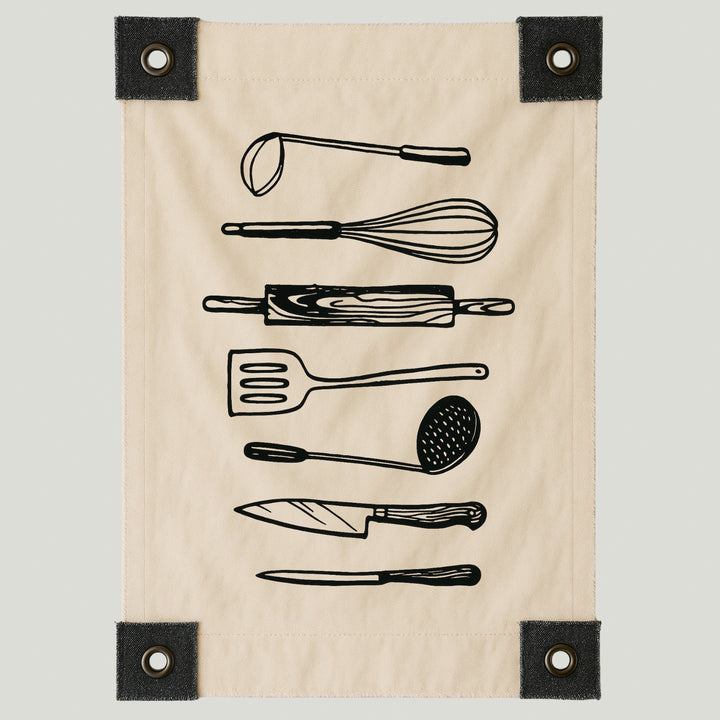 Lienzo con utensilios de cocina estampados en negro sobre fondo natural, ideal para quienes disfrutan cocinar y buscan dar un toque decorativo con estilo. Su diseño moderno y minimalista combina elegancia y calidez, creando una pieza que celebra los momentos cotidianos alrededor de la mesa.