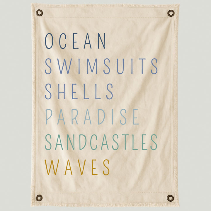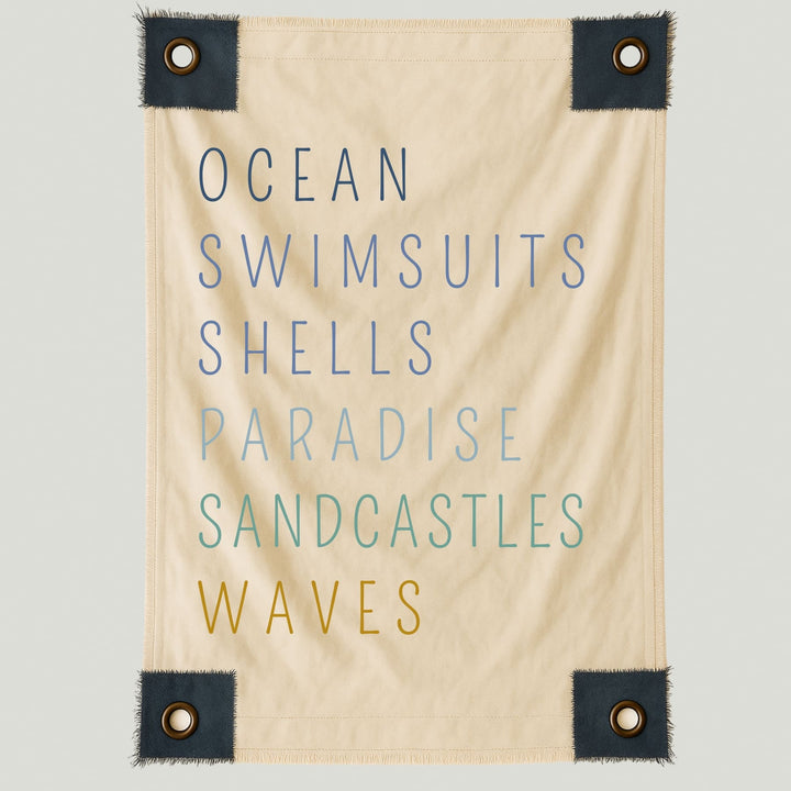 Lienzo con palabras inspiradas en el mar: Ocean, Swimsuits, Shells, Paradise, Sandcastles, Waves. Su diseño vertical en tonos azules, turquesa y arena transmite calma, frescura y esa sensación liviana de los días junto al océano.