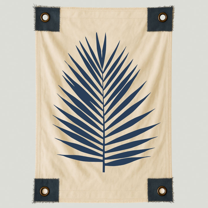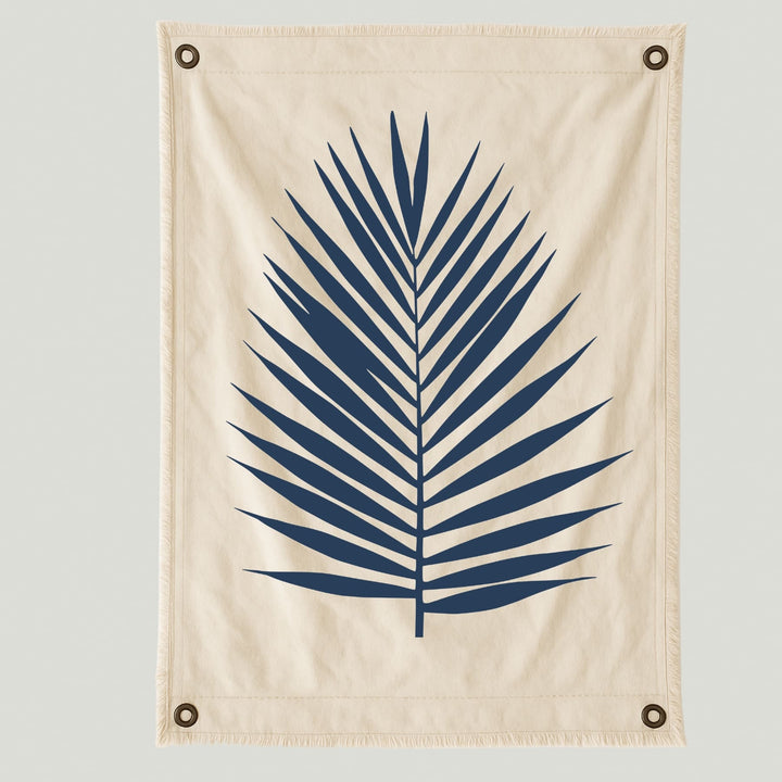 Lienzo con ilustración de una hoja de palma en azul marino, símbolo de frescura, calma y conexión con la naturaleza costera. Su diseño limpio y contemporáneo aporta equilibrio visual y una atmósfera relajada, ideal para quienes buscan un toque playero sofisticado en sus espacios.