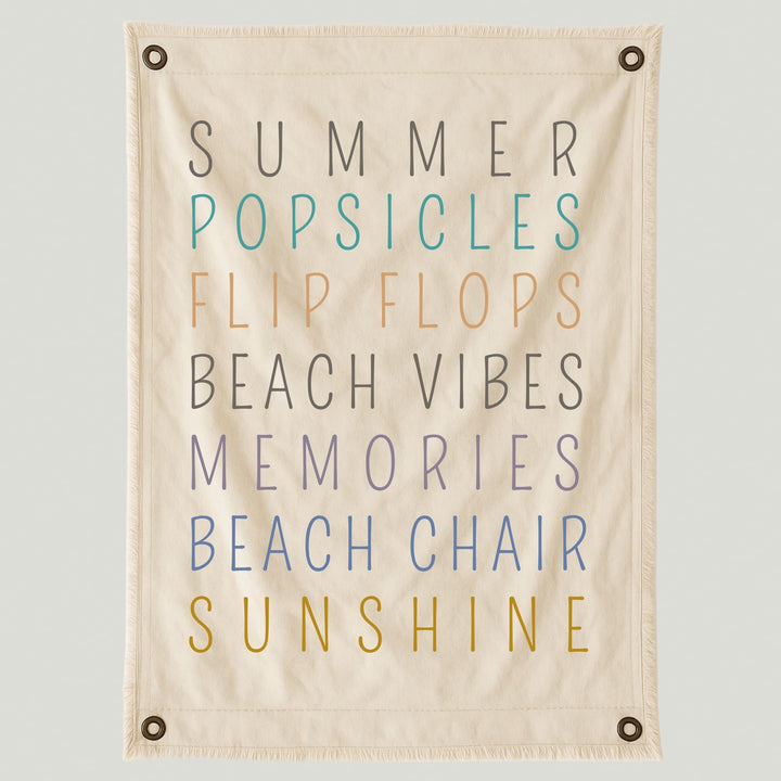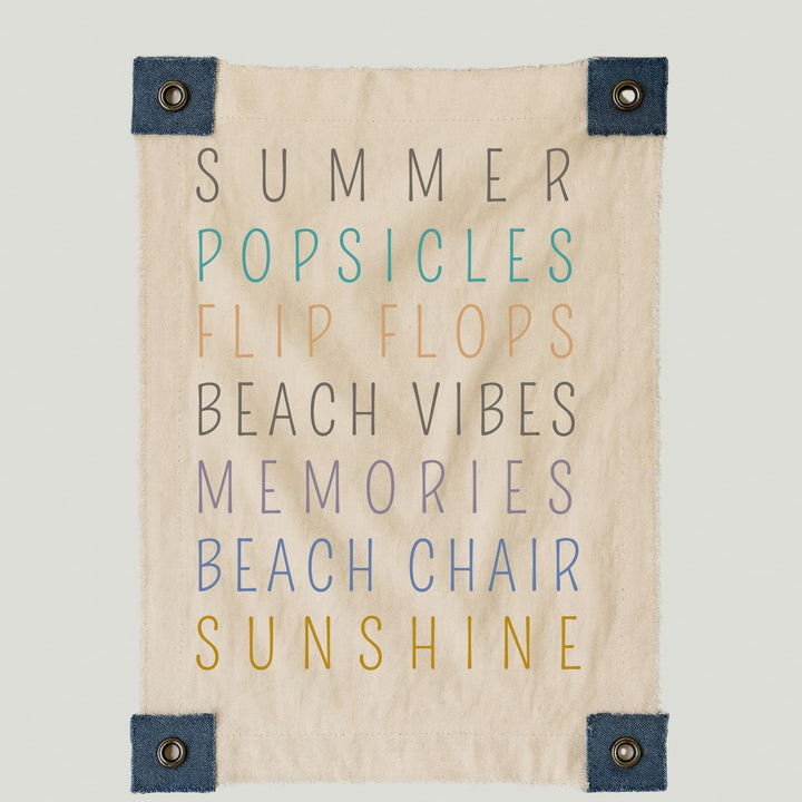 Lienzo con palabras que evocan los días de verano: Summer, Popsicles, Flip Flops, Beach Vibes, Memories, Beach Chair, Sunshine. Su paleta de tonos cálidos y fríos refleja la energía del sol, la arena y el mar.