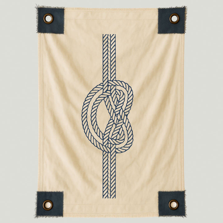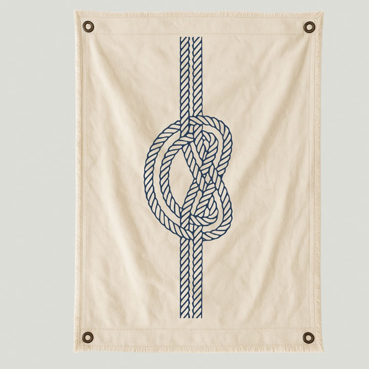 Lienzo con diseño de un nudo náutico en tonos azul marino, símbolo de conexión, fuerza y equilibrio. Su trazo definido y elegante evoca el espíritu del mar y la vida costera, aportando un toque clásico y atemporal a cualquier espacio.