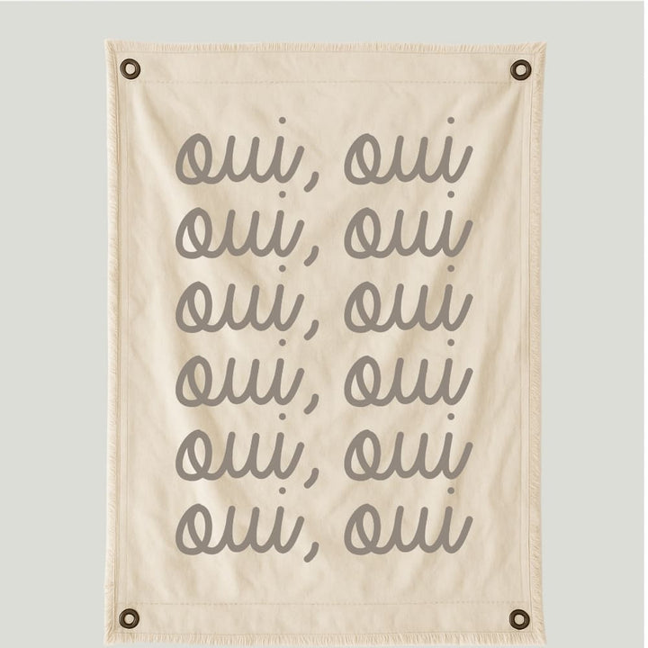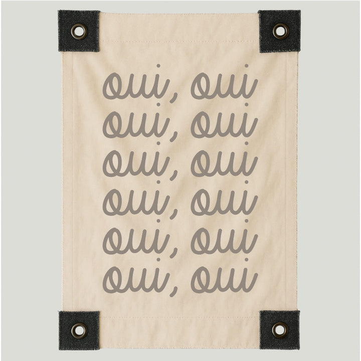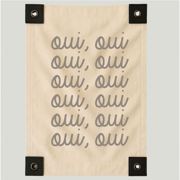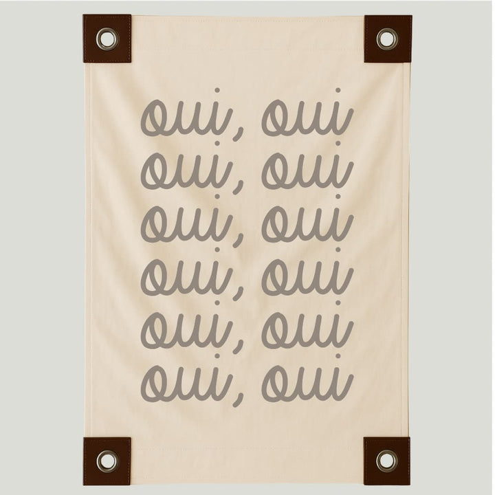 Lienzo con frase en francés “Oui, Oui” —“Sí, sí”—, una expresión alegre y optimista que aporta energía positiva y encanto francés a cualquier espacio. Su repetición en tonos gris suave sobre fondo natural crea un diseño moderno, equilibrado y visualmente atractivo.