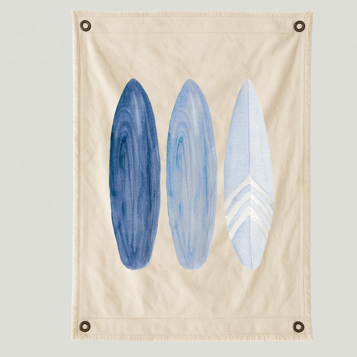 Lienzo con ilustración de tablas de surf en tonos azules, que evocan la calma del mar y el espíritu libre del verano. Su diseño simple y equilibrado aporta frescura y movimiento, ideal para quienes aman el surf y el estilo de vida costero.