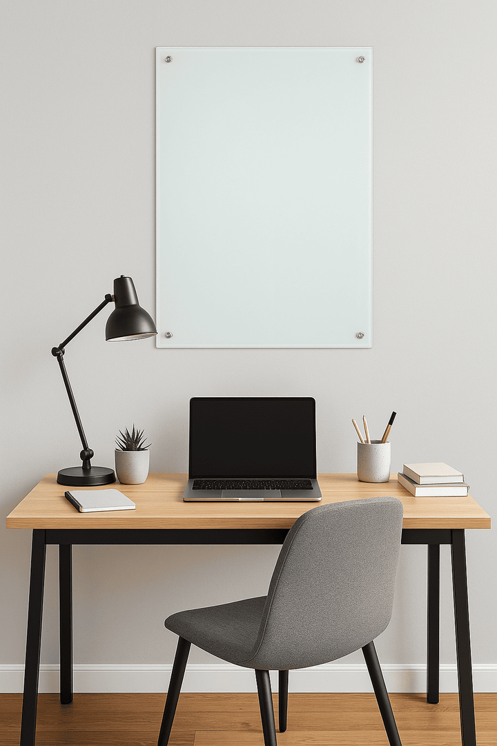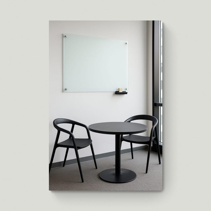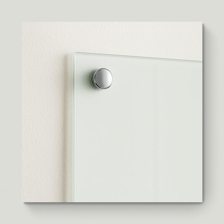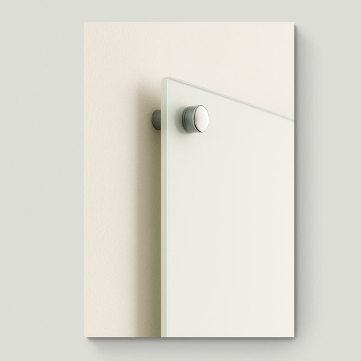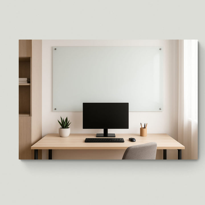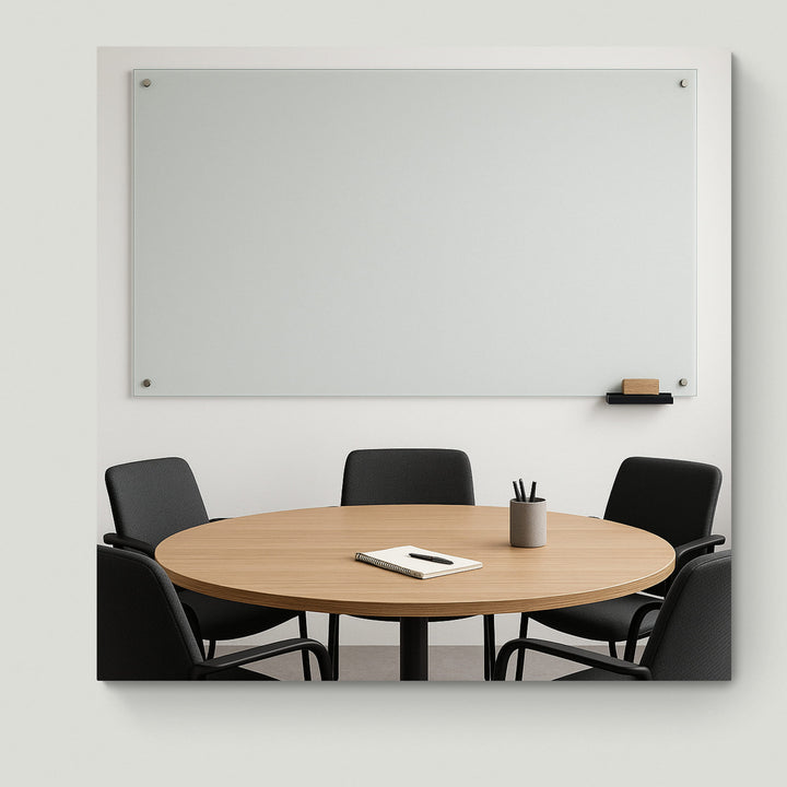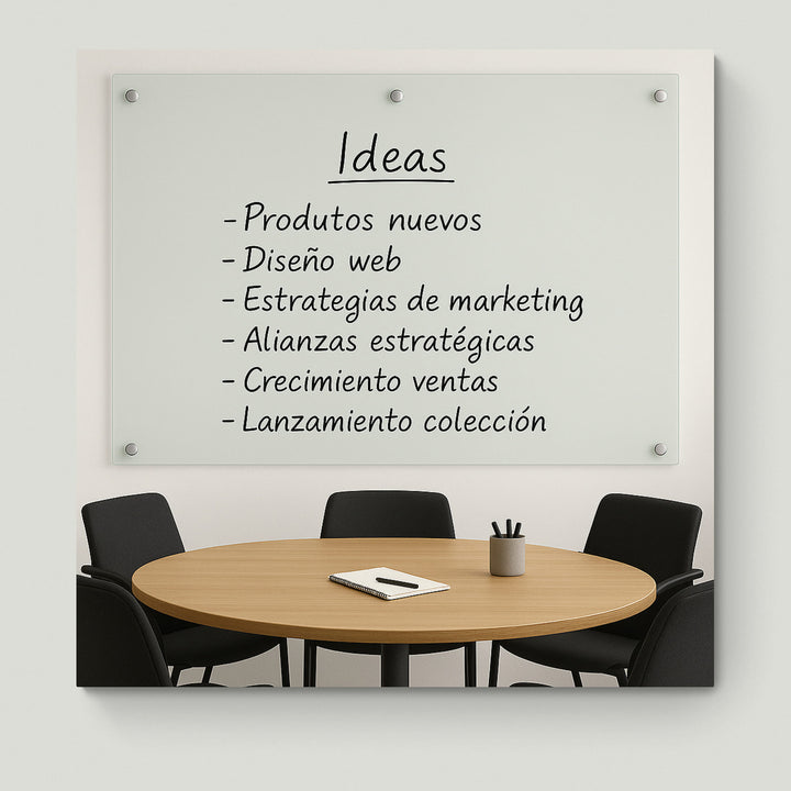 Agrega funcionalidad y elegancia a tus espacios de trabajo con nuestras pizarras de vidrio templado. Fabricadas con vidrio serigrafiado blanco fosco (mate) de 6 mm de espesor, cuentan con cantos pulidos brillantes que realzan su terminación moderna y minimalista. Incluye botones de metal cromado para su instalación.